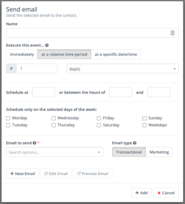 Sends a transaction or marketing Email to the selected Contact. You can send a transactional Email to the Contact multiple times. You can only send a marketing Email to the Contact once across multiple sources. If the Contact has already received this Email from another source or the current Campaign, they aren’t sent the Email again and the Contact progresses through the Campaign. |