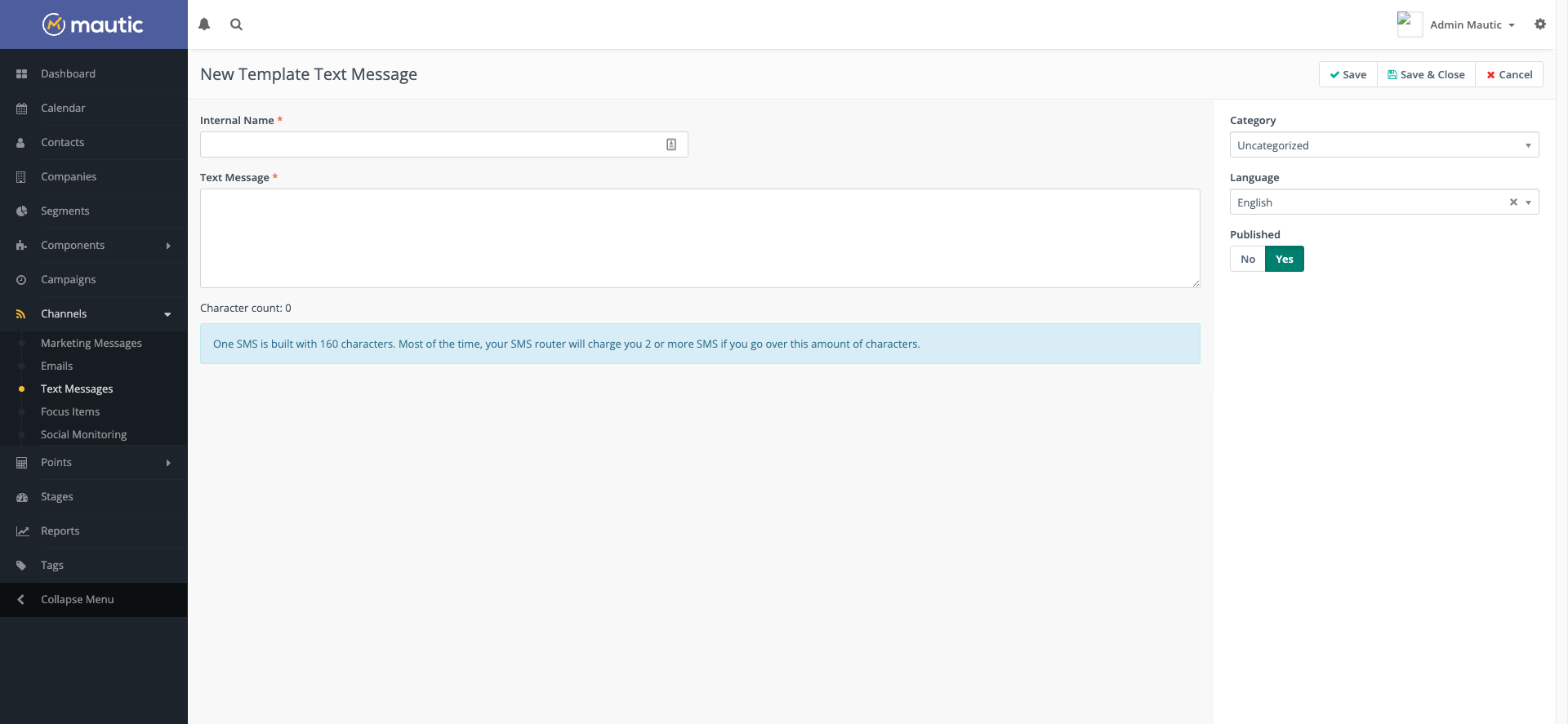 Internal name - This is the internal name used within Mautic when referring to this Text Message. For example, Mautic uses this in dropdown selection lists in the Campaign Builder.