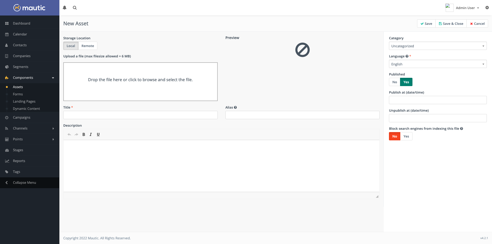Navigate to Components > Assets. Mautic lists any Assets you have previously created. Click New to begin creating an Asset.