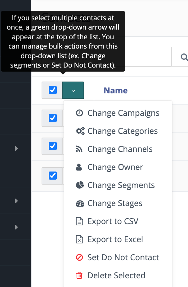 To make updates to several Contacts at once, select those Contacts then click the green arrow at the top of the checkbox column.