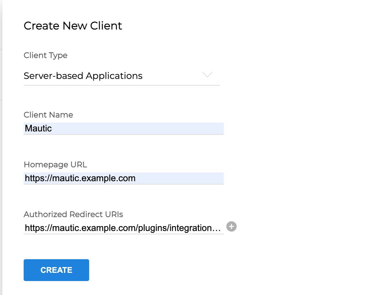 Select Server Based Applications and provide a name for the client; the URL of your Mautic instance, and the callback URL (which you can access by going to Plugins > ZohoCRM in Mautic and copying the callback URL, usually in the format