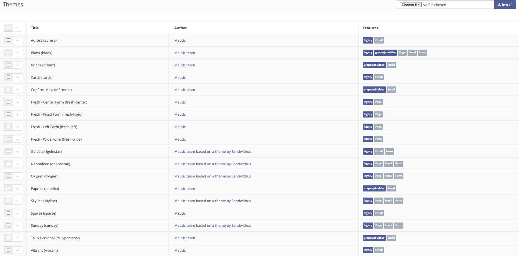A basic Mautic installation comes pre-packaged with a number of Themes for you to use ‘as-is’ or adapt to suit specific projects.